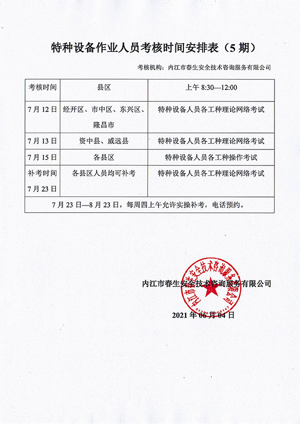 2021年春生公司05期特種設(shè)備作業(yè)人員考核時間安排