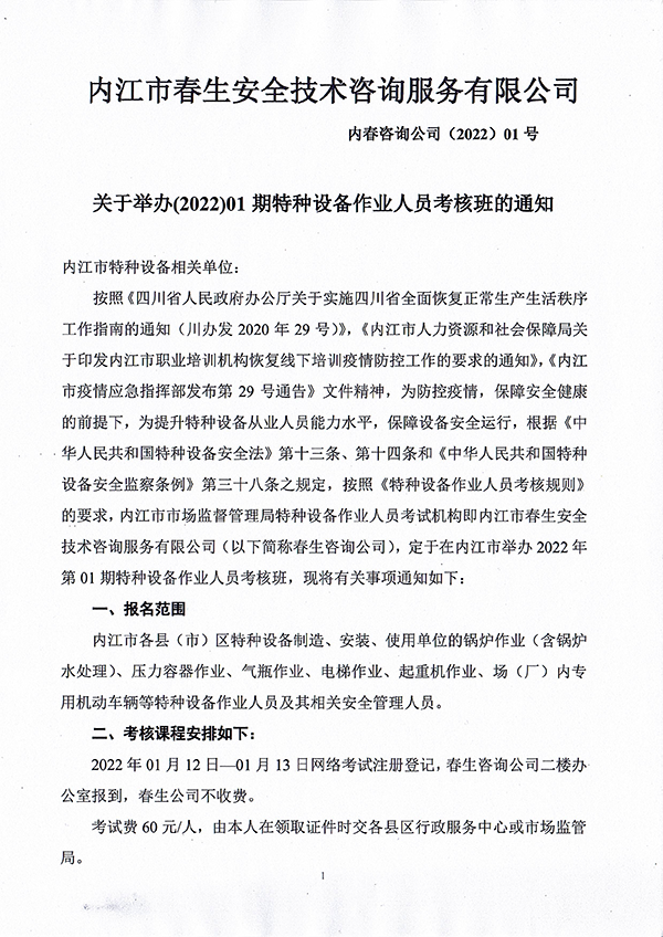 2022年春生公司01期特種設備作業(yè)人員考核班通知