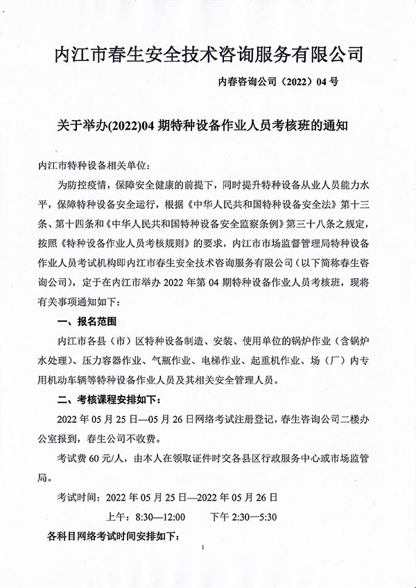 2022年春生公司04期特種設(shè)備作業(yè)人員考核時(shí)間安排