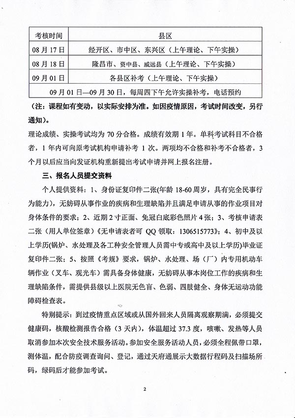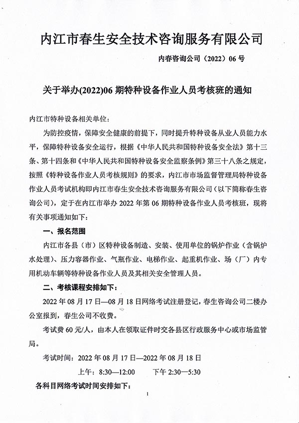 2022年春生公司06期特種設備作業(yè)人員考核時間安排