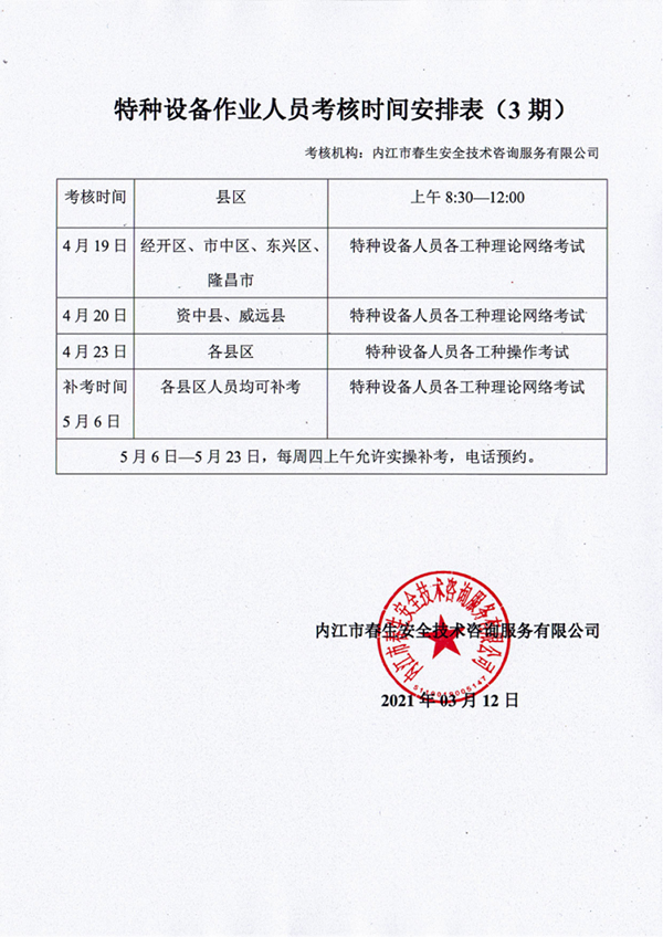 2021年春生公司03期特種設(shè)備作業(yè)人員考核時(shí)間安排