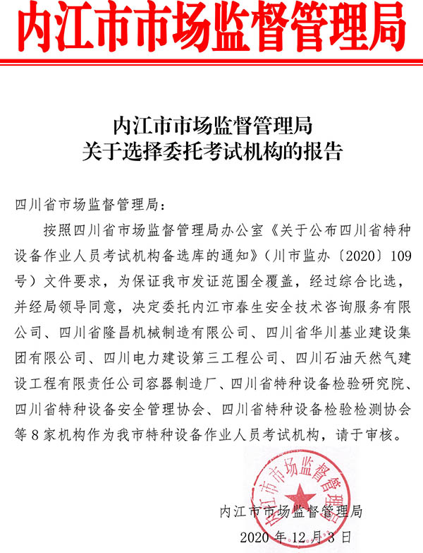 內(nèi)江市市場監(jiān)督管理關(guān)于選擇委托考試機構(gòu)的報告